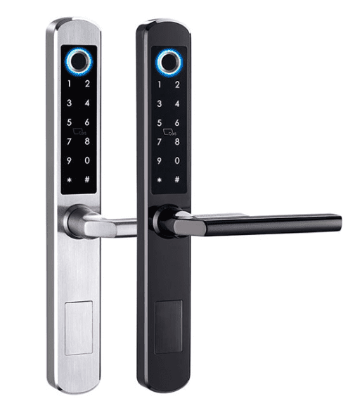 Pegue oFechadura de porta fina e inteligente com impressão digital - FM 210 como exemplo. Este produto suporta controle por meio do APP TUYA / TT Lock, com métodos de desbloqueio incluindo impressão digital biométrica, código, NFC, RF ID e chaves mecânicas.